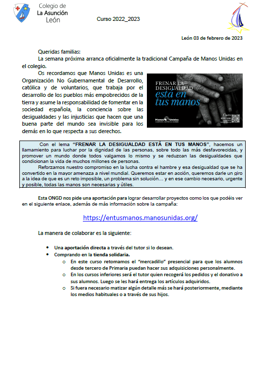 Ya hemos puesto en marcha la semana de Manos Unidas, que este año volverá a contar con el tradicional mercadillo presencial y culminará el viernes con el pequeño "ayuno voluntario" que venimos organizando con la adquisición de una pieza de fruta. Os invitamos a participar en esta campaña tan importante para nuestro cole.