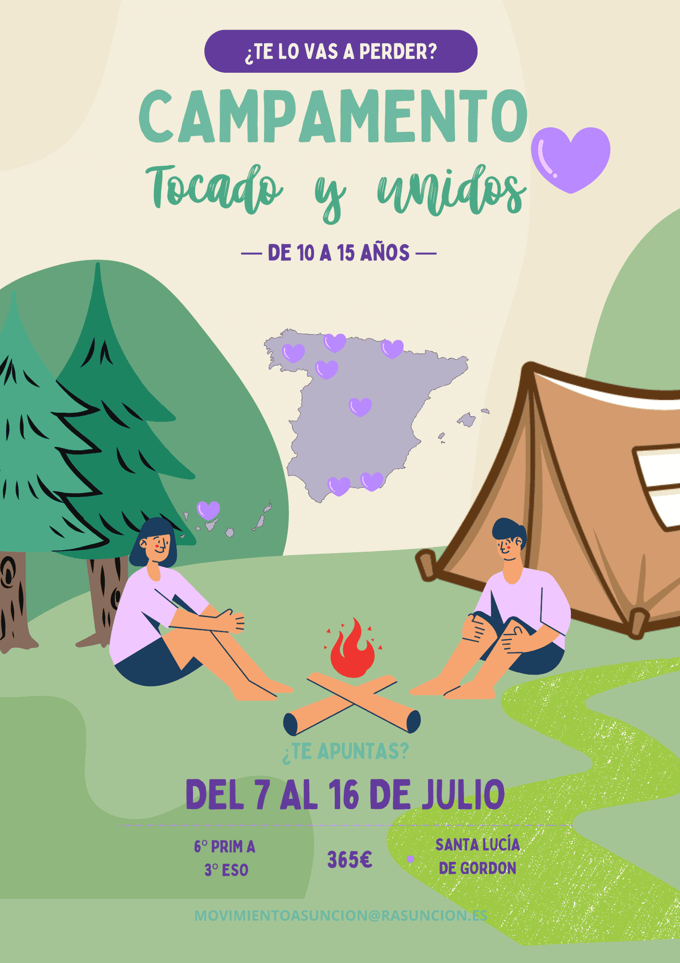 Ya podéis inscribiros en las actividades de verano 2024. Los alumnos de 6º de Primaria a 3º de ESO pueden apuntarse al campamento que se desarrolla en Geras de Gordón, mientras que los alumnos de 4º de ESO pueden apuntarse al Camino de Santiago, que se desarrollará del 47 al 14 de julio. Los alumnos de Bachillerato pueden inscribirse en Asunción Joven Solidaria, que tendrá lugar en Dalías entre el 7 y el 16 julio. Por último, para Bachillerato existe la opción de optar por el encuentro ecuménico interreligioso Taizé.