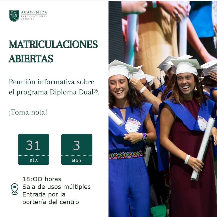 Nuestro cole, en colaboración con Academica, principal institución educativa de centros concertados en EEUU, ofrece a nuestros alumnos la posibilidad de obtener la doble titulación del bachillerato español y el título High School (bachillerato americano). En la reunión les informaremos sobre las características del programa, las asignaturas que lo componen, los itinerarios posibles y las condiciones económicas, así como sobre cualquier otra cuestión que pueda resultar de su interés.