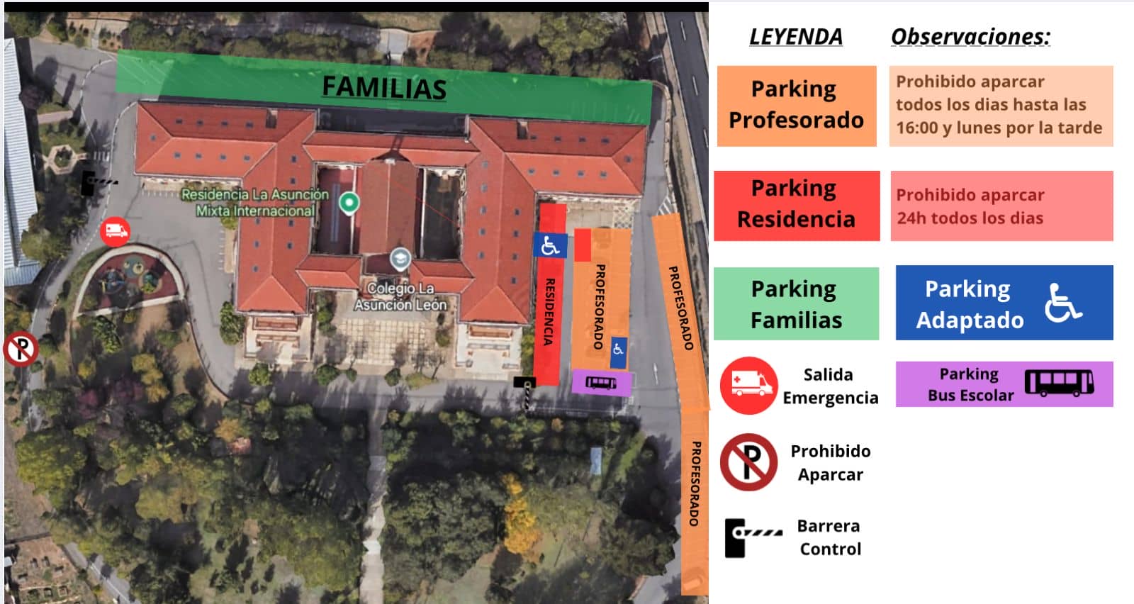 Os recordamos que, por la seguridad de los alumnos y de todos los miembros de la comunidad educativa, es importante cumplir con el protocolo de acceso de vehículos al centro escolar. Recordamos además que está prohibido aparcar en las zonas rojas de la imagen superior y que las familias deben estacionar sus vehículos en la parte de atrás del edificio.