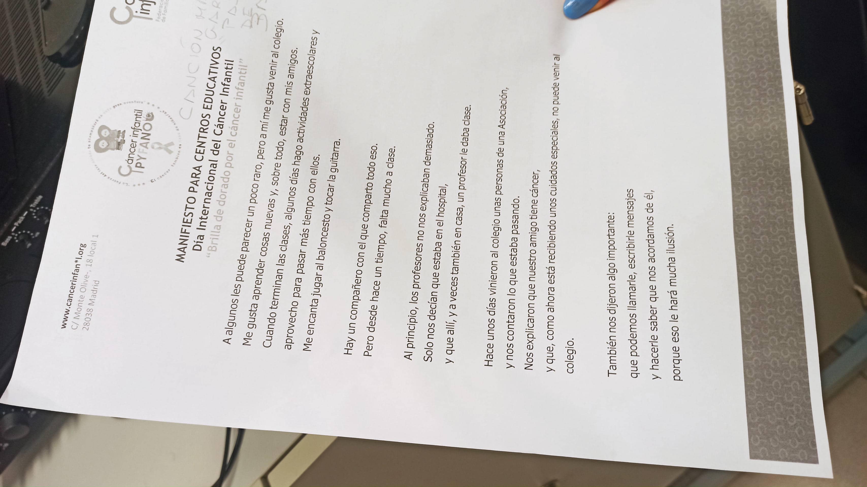 Hoy, con motivo del Día Internacional del Cáncer Infantil, los alumnos y profesores de Secundaria y Bachillerato hemos comenzado la jornada cambiando la oración por la lectura de un manifiesto para centros educativos. Un momento de reflexión y solidaridad que nos ha conmovido profundamente, especialmente al recordar a familiares, amigos y miembros de nuestra comunidad que han vivido de cerca esta enfermedad.