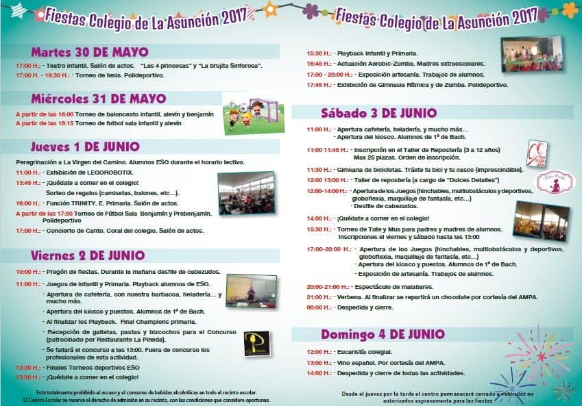 Los próximos días 2, 3 y 4 de junio celebramos las tradicionales fiestas colegiales. Esta edición es especial para nosotros porque tendrá lugar en el marco de la celebración del 75 aniversario del centro. A continuación es posible consultar el prorgrama completo de actos. Para visualizar el documento completo, solamente es necesario pinchar sobre la imagen.