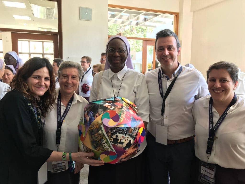 En la fotografía se aprecia el símbolo que España ha llevado al Encuentro: el rostro de una provincia unida, con diferentes realidades aportadas por cada comunidad y cada colegio, en la que cada una se complementa con la otra y que juntas colaboran en un mundo que se va transformando con los valores del Evangelio.