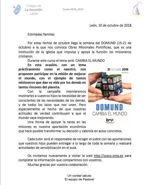 Les invitamos a leer la comunicación de nuestro equipo de Pastoral sobre la semana del DOMUND que comienza el 15 de octubre.