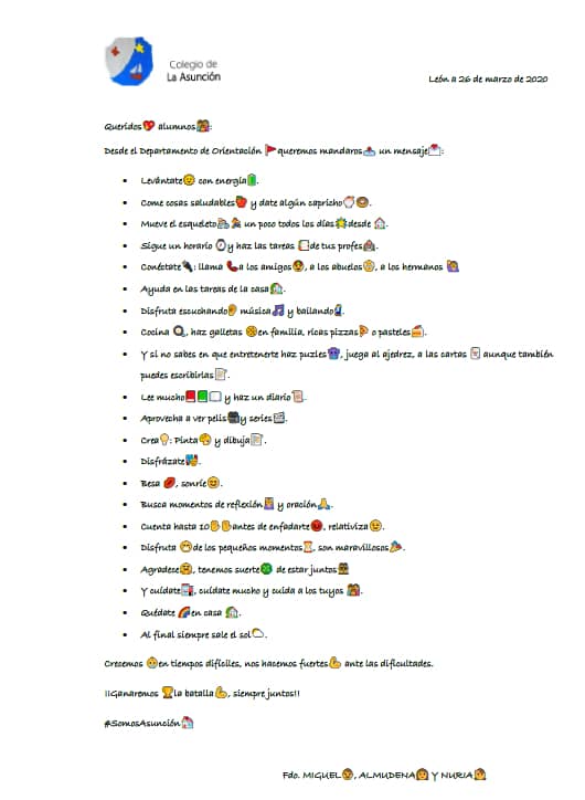 Nuestro Departamento de Orientación ha elaborado una carta de ánimo a todos nuestros alumnos en la que proporcionan ideas para pasar estos días en casa. Os invitamos a leerla y a disfrutarla. También podéis descargar el archivo completo al final de esta información.