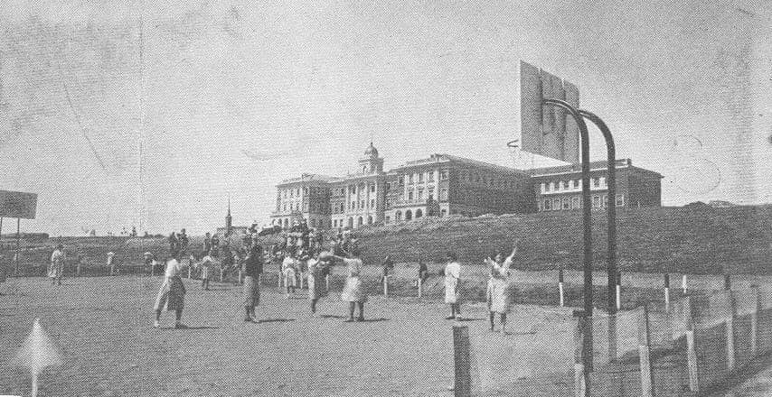 La imagen que hemos elegido hoy en #AsunciónLeón75 nos permite ver a alumnas jugando en el antiguo campo de baloncesto y comprobar cuánto ha cambiado el entorno del Colegio.