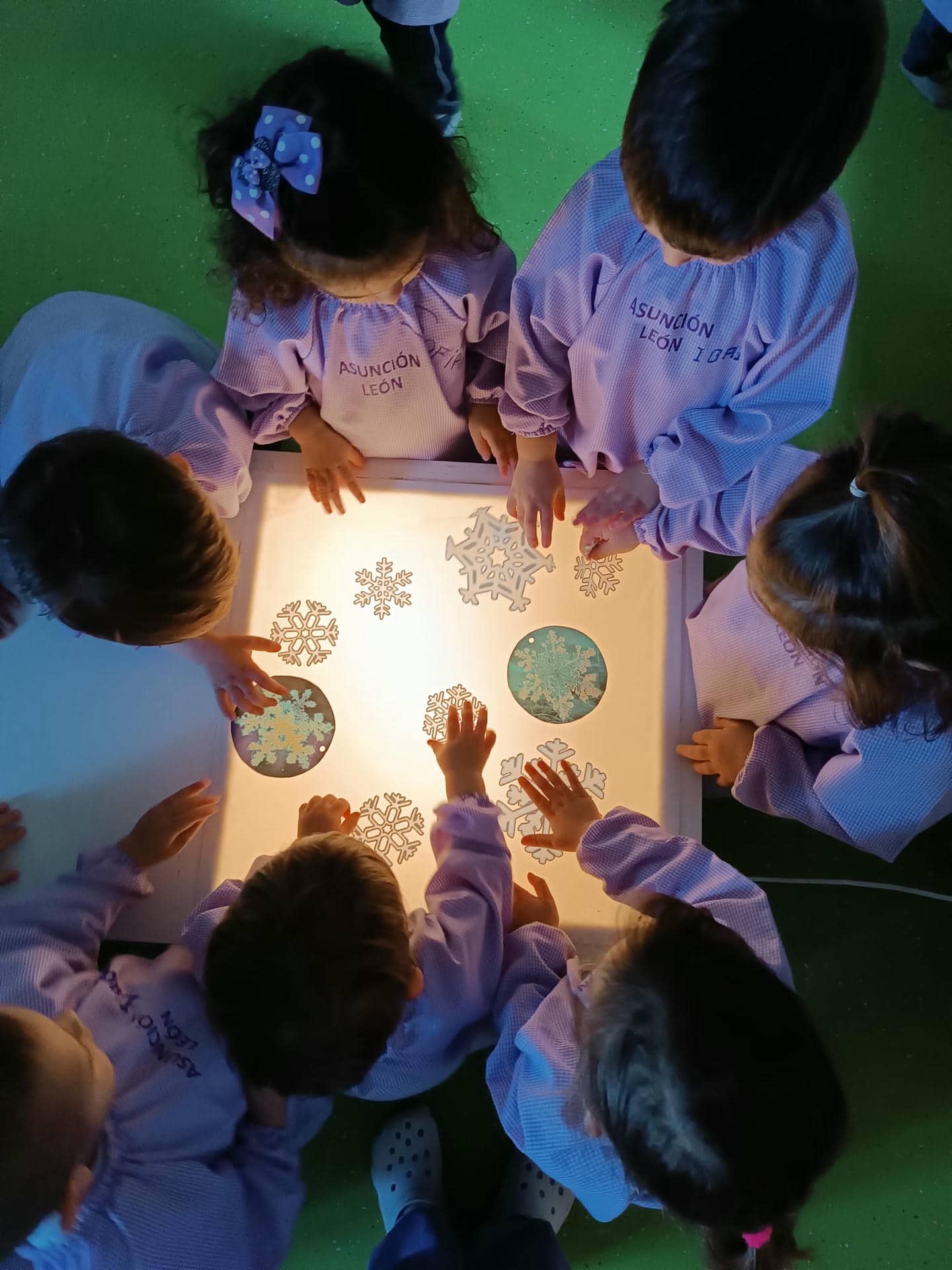 Esta semana el invierno ha llegado a nuestras aulas de 1 y 2 años. Nuestros peques han desarrollado sus sentidos experimentando con sensaciones y cualidades invernales, a través de diferentes experiencias: hemos creado un paisaje nevado con nata fría, pintado piñas, explorado diferentes materiales sensoriales con la mesa de luz, hemos tocado y pintado hielo e incluso creado nieve casera.
