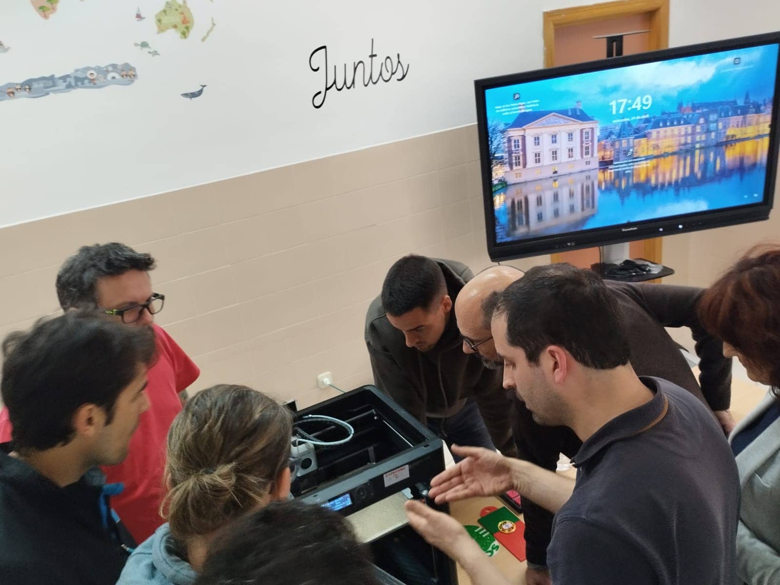Un grupo de profesores del colegio ha asistido a una formación sobre impresión 3D impartida por un técnico especialista. Gracias a ella podrán comenzar a utilizar las dos impresoras 3D con las que contará el centro. Además de hablar sobre las características de estas máquinas industriales, en la sesión se trató también de los consumibles que utilizan y de los pasos iniciales para poder construir piezas. Al finalizar, pudieron terminar su primera impresión.