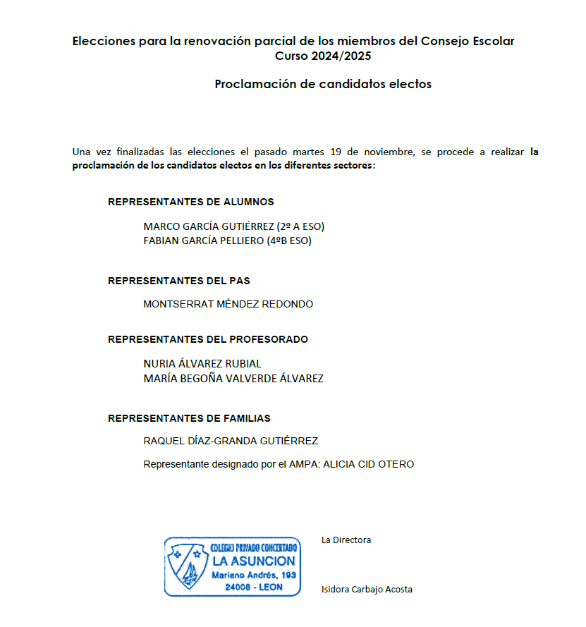Esta es la lista de los candidatos electos de las elecciones a renovación parcial del Consejo Escolar. Pueden descargar el documento al final de esta información.