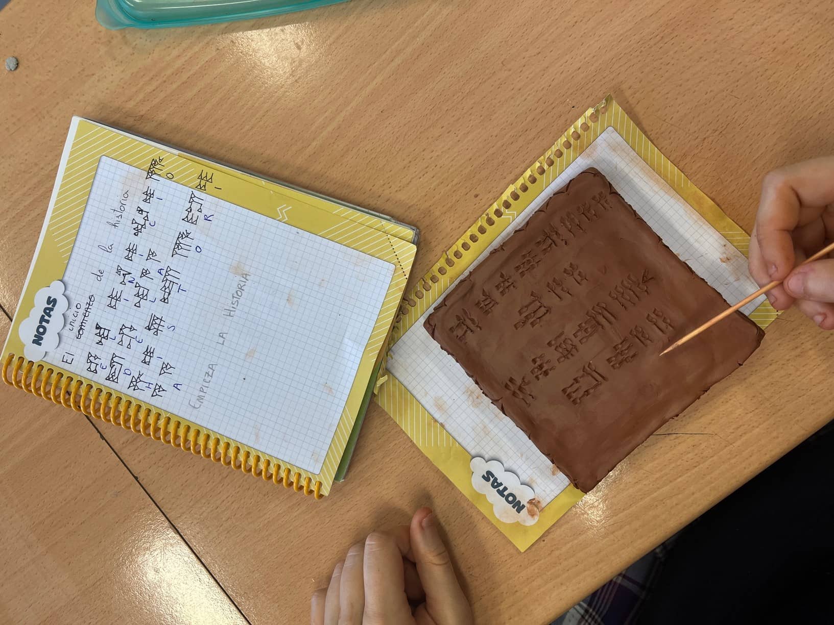 Los alumnos de 1º de ESO están conociendo la historia antigua y las civilizaciones de Egipto y Mesopotamia. Una de las actividades que han realizado esta semana tiene que ver con la escritura cuneiforme. Cada uno ha escrito en su tablilla para aprender más sobre esta forma de escritura que data del 2800 a.C.