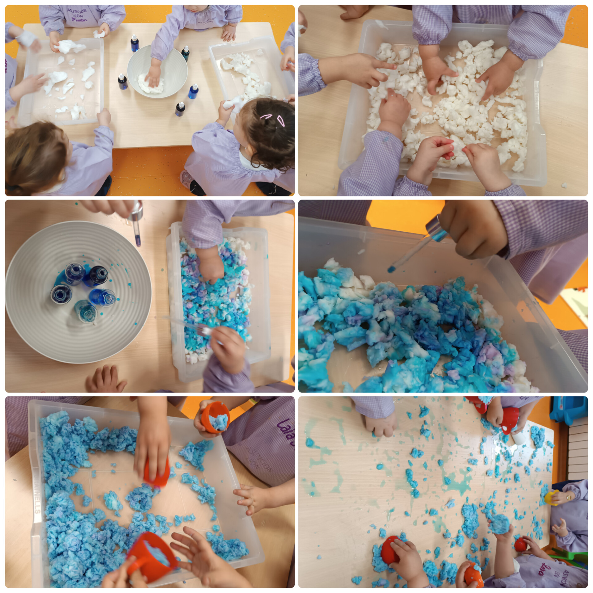 De esta manera desarrollamos el sentido del tacto y la destreza manual. Una vez desmenuzado todo, pintamos nuestras nubes con agua y colorante alimenticio utilizando pipetas, desarrollando así la motricidad fina.
