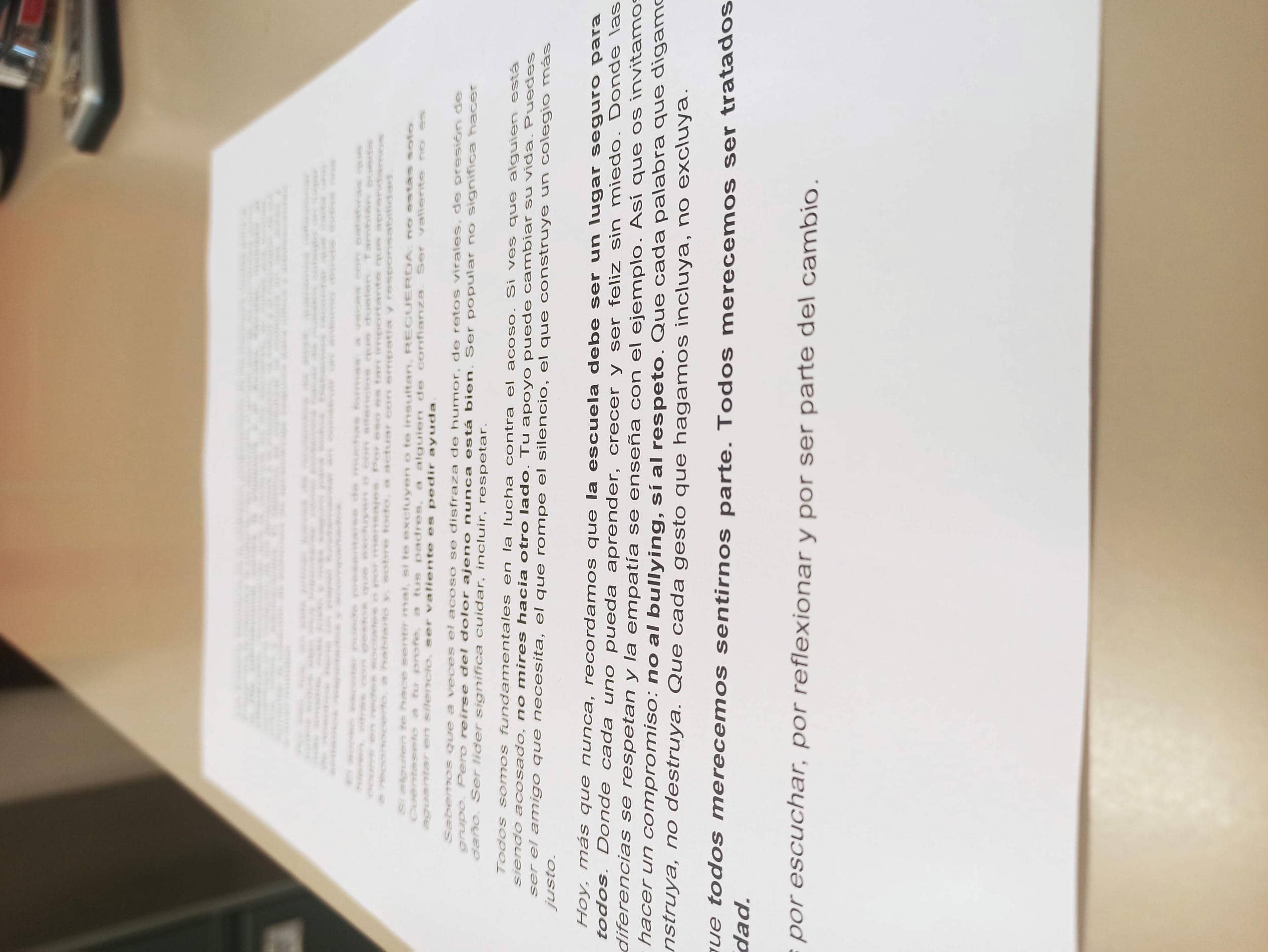 Hemos leído un manifiesto para expresar nuestro compromiso para combatir el acoso escolar. Hoy, más que nunca, recordamos que la escuela debe ser un lugar seguro para todos. No al bullying, sí al respeto. Que cada palabra que digamos construya, no destruya. Todos merecemos ser tratados con dignidad.
