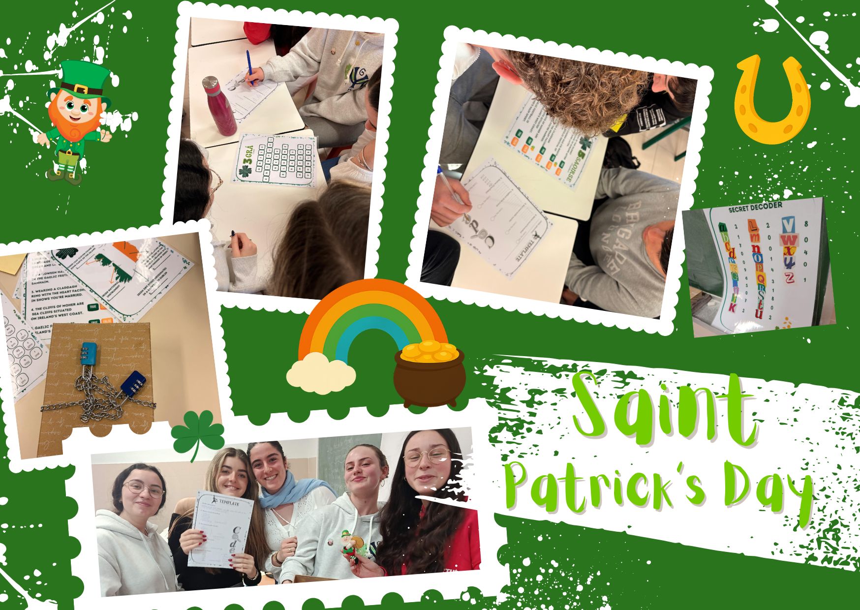 Durante la actividad, los estudiantes se organizaron en equipos y recorrieron las aulas y pasillos del centro siguiendo pistas y resolviendo desafíos relacionados con el idioma, la fonética, la simbología, las tradiciones y las leyendas de Irlanda. Cada reto se convertía en una oportunidad para poner en práctica su inglés de manera dinámica, aplicada y, sobre todo, muy divertida.