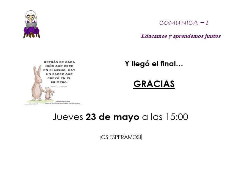 Este jueves día 23 de mayo clausuramos un curso más de COMUNÍCA-t. Os esperamos a todos los que formáis este bonito taller para compartir un ratito juntos y brindar por un curso más a vuestro lado.